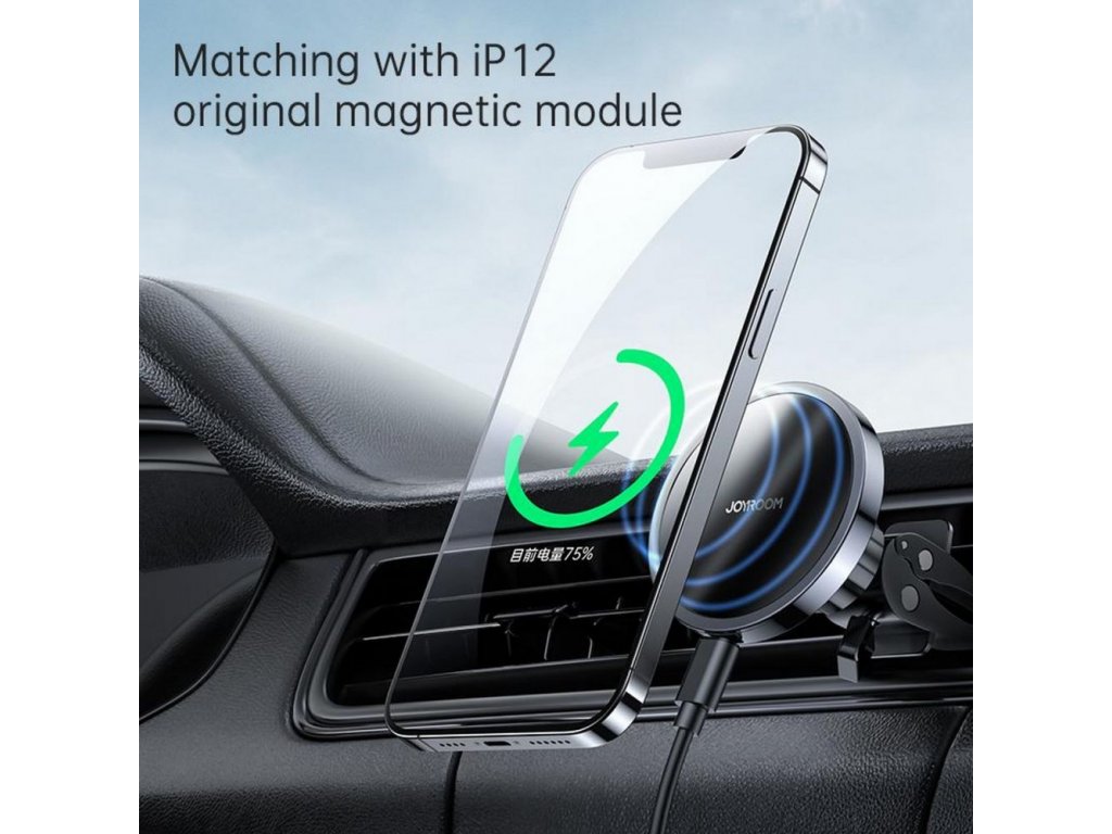 Bezdrátová rychlá nabíječka a držák do auta pro iPhone Joyroom Magnetic Mount v sobě spojuje nabíječku a pevný bod pro uchycení telefonu v autě. Jedná se o bytelný držák do ventilační mřížky vozidla a bezdrátovou nabíječku s nejnovější možností nabíjení MagSafe.