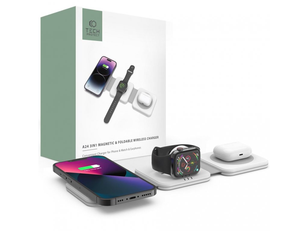 Nabíječka Tech-Protect A24 je víceúčelové zařízení kompatibilní s produkty značky Apple, která podporují nabíjení Magsafe. Má také možnost bezdrátově nabíjet hodinky Apple Watch a AirPods.