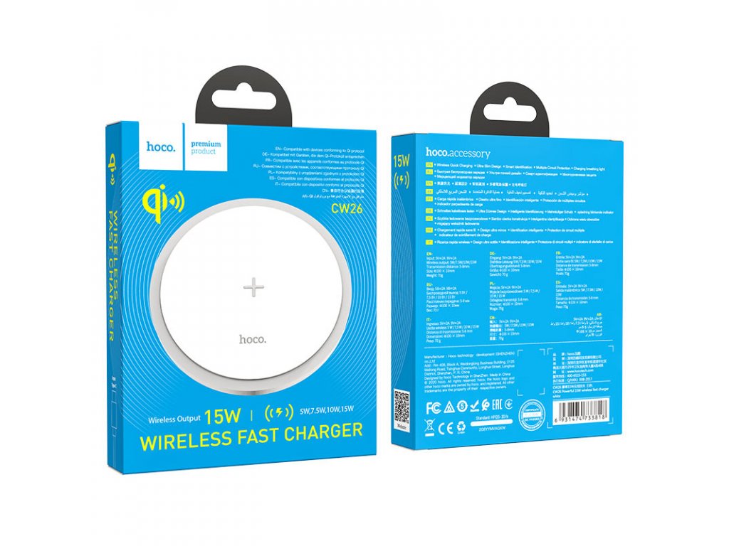 Rychlá bezdrátová nabíječka Hoco CW26 je jednoduchou nabíjecí plochou pro všechny kompatibilní telefony se standardem Qi nebo třeba sluchátka AirPods. Poskytuje nabíjení výkonem až 15 W a s tenkým 10mm profilem se jedná o velmi elegantní zařízení.