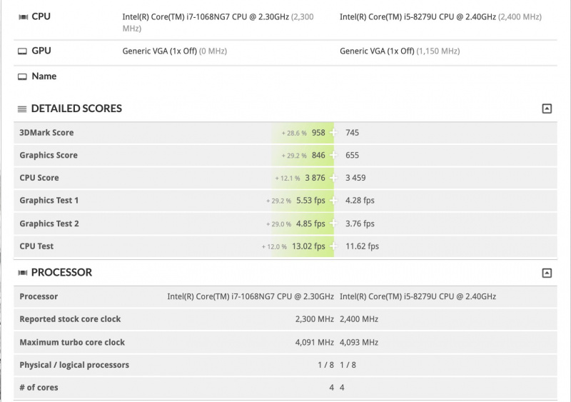 Srovnávací údaje porovnávají nový čip 10. generace s čipem Core i5 8. generace, který nyní je ve špičkovém 13palcovém MacBooku Pro z roku 2019. Výsledky ukazují, že nový 13palcový stroj byl přibližně o 12 % rychlejší než současný 13palcový MacBook Pro, pokud jde o rychlosti procesoru, a téměř o 30 % rychlejší, pokud jde o grafický výkon.