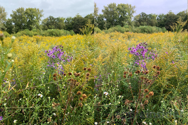 Fotografie na poli vyšla také lépe pro iPhone 11. Zachytil květiny s lepším vyvážením barev a snímek se zdá být i ostřejší a kontrastnější.