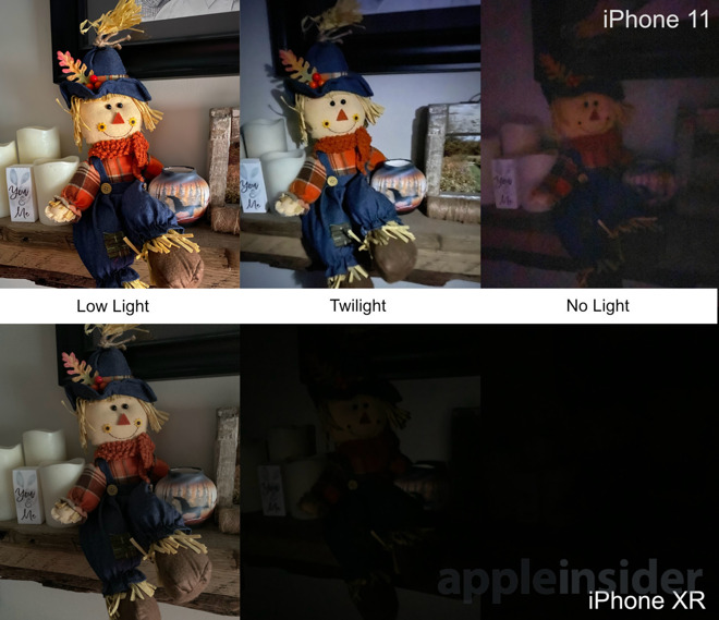Největším rozdílem je ale jistě noční režim. Novinka, která se poprvé objevuje v letošních iPhonech zcela jasně přebíjí tmavé fotografie od iPhonu XR. Na sadě 3 fotografií byl postupně ztlumeno světlo v místnosti a výsledky jsou naprosto jasné. iPhone XR měl problémy i na nejsvětlejší scéně, zatímco iPhone 11 zvládl skvěle zachytit první dvě fotografie a na třetí je stále vidět fotografovaný objekt. iPhone objektiv novinky tak jasně dominuje.