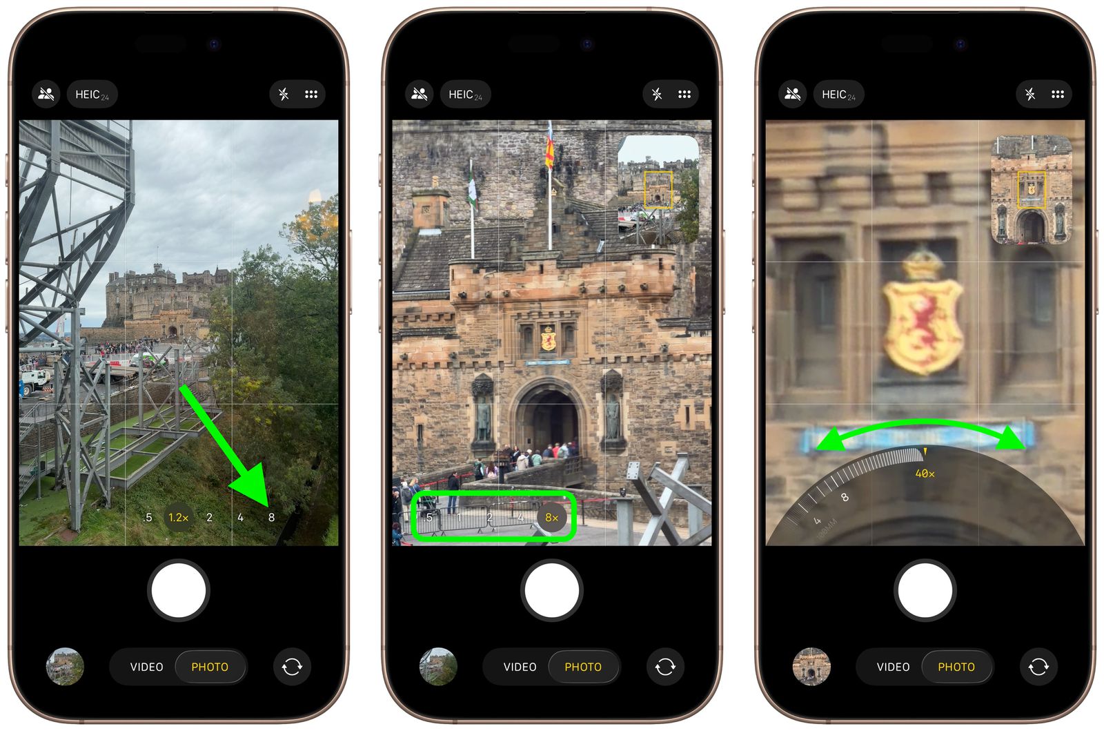 V nativní aplikaci Fotoaparát stačí klepnout na tlačítko 8× ve spodní části hledáčku. Další dostupné kroky jsou 0,5×, 1×, 2× a 4×. Pokud potřebujete ještě větší přiblížení, můžete přejetím prstu po volbě zoomu aktivovat až 40× digitální zoom. Je však třeba počítat s tím, že kvalita snímku se s vyšším digitálním přiblížením snižuje.