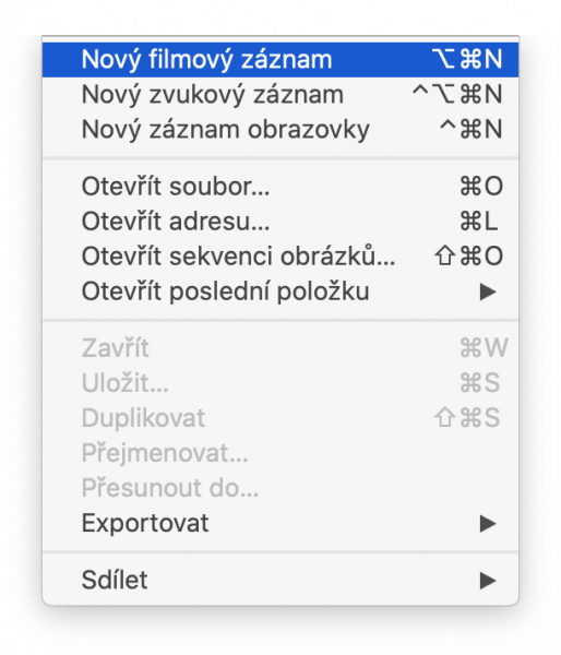 - Po spuštění aplikace QuickTime vyberte z horní nabídky Soubor - Nový filmový záznam
