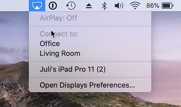 - Na Macu vyhledejte v horním řádku nabídky ikonku AirPlay