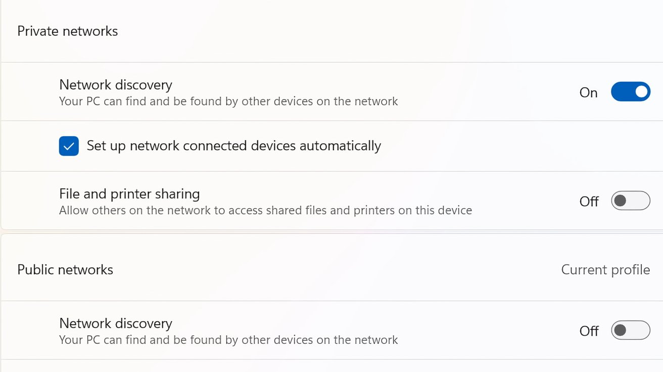 - V sekci Privátní síť aktivujte přepínače „Zjišťování sítě“ a „Sdílení souborů a tiskáren“.