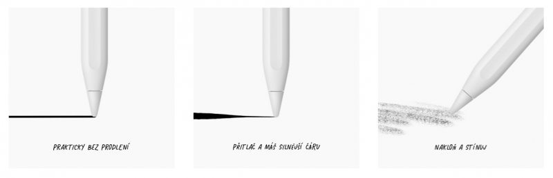 I tento model rozpoznává přítlak a náklon, takže s ním můžete snadno pracovat s tloušťkou čáry, jemně stínovat a používat širokou paletu výtvarných efektů. A to samozřejmě jako s obyčejnou tužkou. Nenabíjí se bezdrátově, jako jeho druhá generace, ale pomocí Lightning konektoru. Také neobsahuje dotykové ovládání a jeho design není tak minimalistický.
