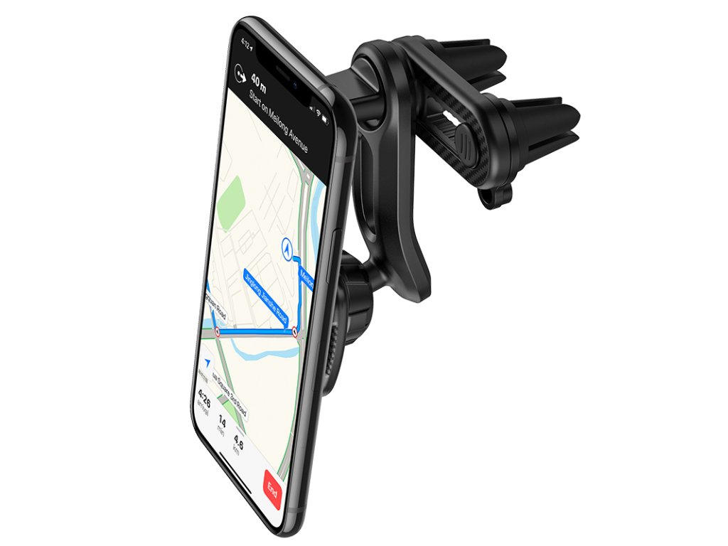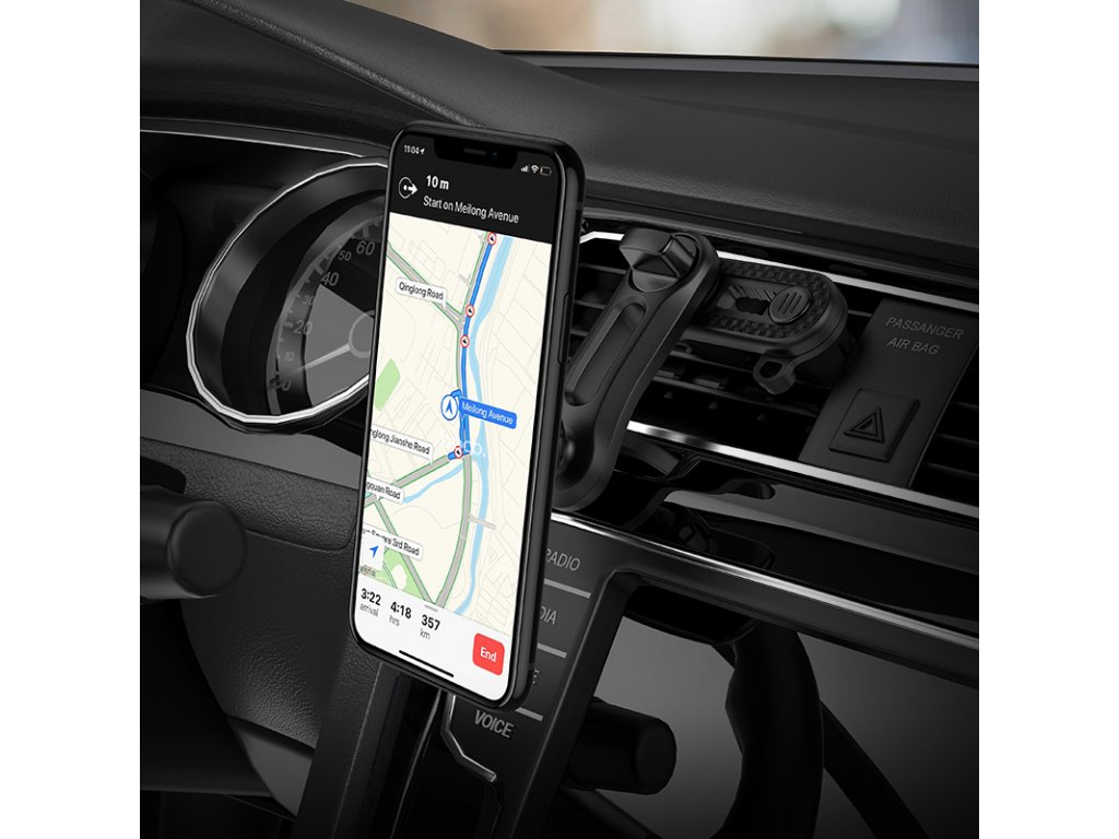 Magnetický držák do auta váží jen 99 gramů, což je velmi málo a snadno ho tak sbalíte i do kapsy. Přesto pevně udrží zařízení na jednom místě. K dispozici je možnost umístění do ventilační mřížky vozidla. V balení naleznete hned dva zobáčky pro vložení do listů ventilace s otočnou hlavou. Ideálně tak přizpůsobíte náklon displeje a držák se nebude v mřížce pohybovat.