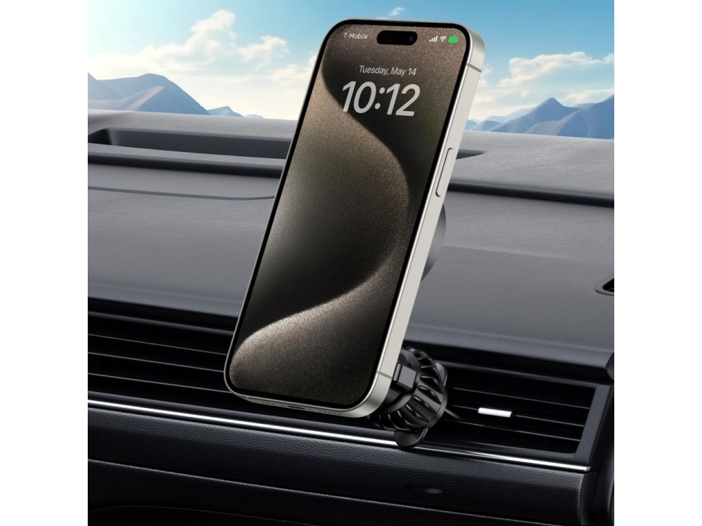 Držák do auta je vyroben z odolného plastu a na přední části je magnet s podporou MagSafe. Ten pevně drží váš telefon díky magnetům, které jsou umístěné v zadní části. Podporovány jsou modely od verze iPhone 12 s funkcí MagSafe