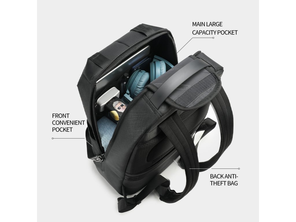Batoh na notebook Tigernu nabídne 18litrový objem a největší kapsu pro uložení až 14palcového zařízení. Je tak vhodný pro 13palcový MacBook Air nebo třeba 14palcový MacBook Pro. Ten pak snadno zajistíte přesahující částí na suchý zip. Pro lepší organizaci je na batohu více kapes, takže si snadno vyčleníte prostor pro konkrétní doplňky. Přední postranná kapsa je vhodná pro vložení nabíjecího adaptéru, powerbanky nebo třeba externího disku. Zadní v oblasti beder je zase skvěle chráněna před prsty nenechavců. Uvnitř pak najdete menší kapsičku na vložení cestovních dokladů a další spoustu menších přihrádek.