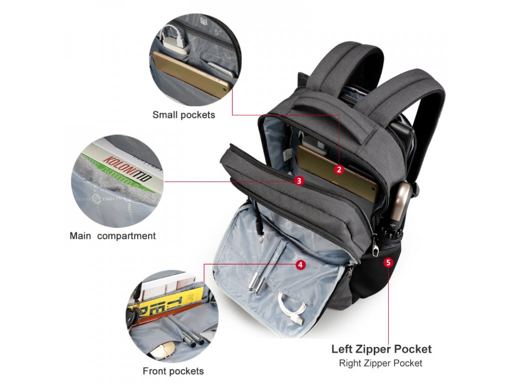 Městský batoh Tigernu T-B3259 je kompaktním batohem pro notebooky až do velikosti úhlopříčky 15,6 palců. Příjemné rozměry dovolují jeho časté přenášení a oceníte také jeho nízkou váhu. Přes tyto malé rozměry pojme mnoho příslušenství a doplňků.