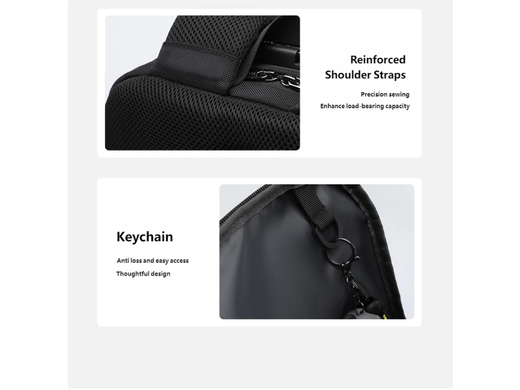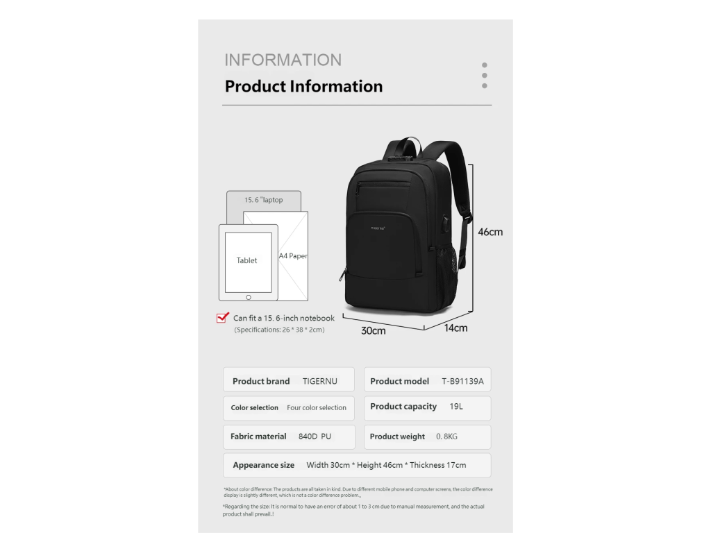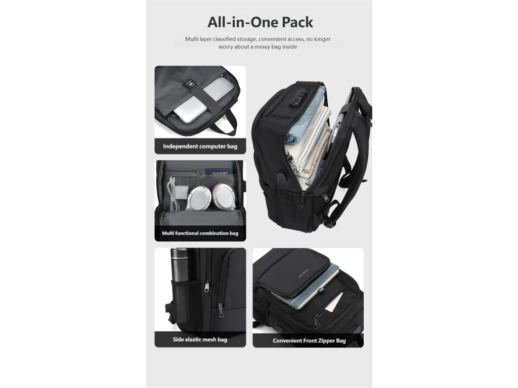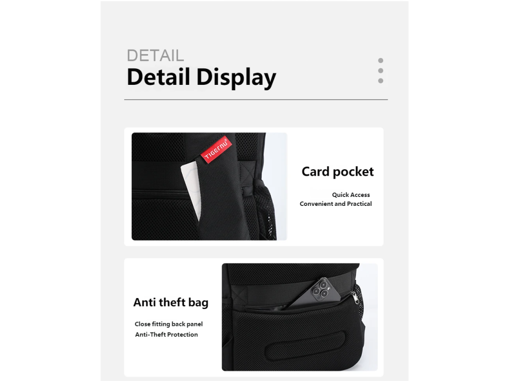 Batoh Tigernu je vynikající volbou, jak si uložit na cesty všechny své věci. Notebook je bezpečně umístěn v zadní části batohu v největší kapse. K němu můžete přihodit velká sluchátka, něco na čtení a další věci, které se vám budou na cestu hodit. Vpředu je pak menší kapsa, která má v sobě několik přihrádek a je tak vhodná pro uložení psacích potřeb, cestovních dokladů a jiných drobnějších věcí. Pod ní je ještě jedna menší, kam umístíte třeba menší tablet nebo telefon.