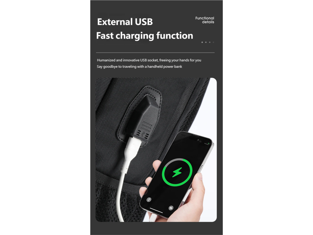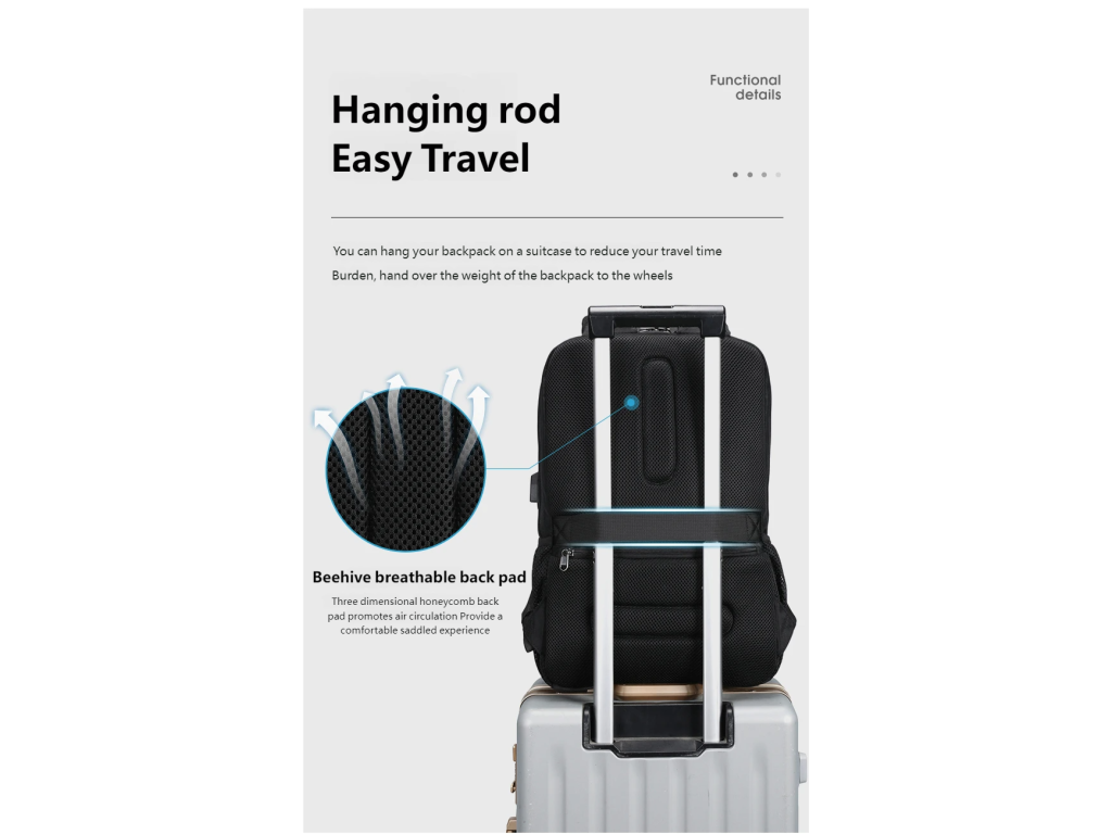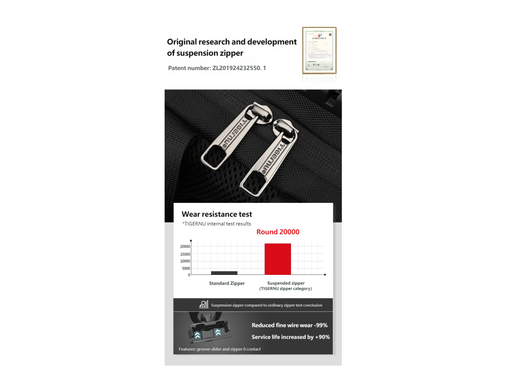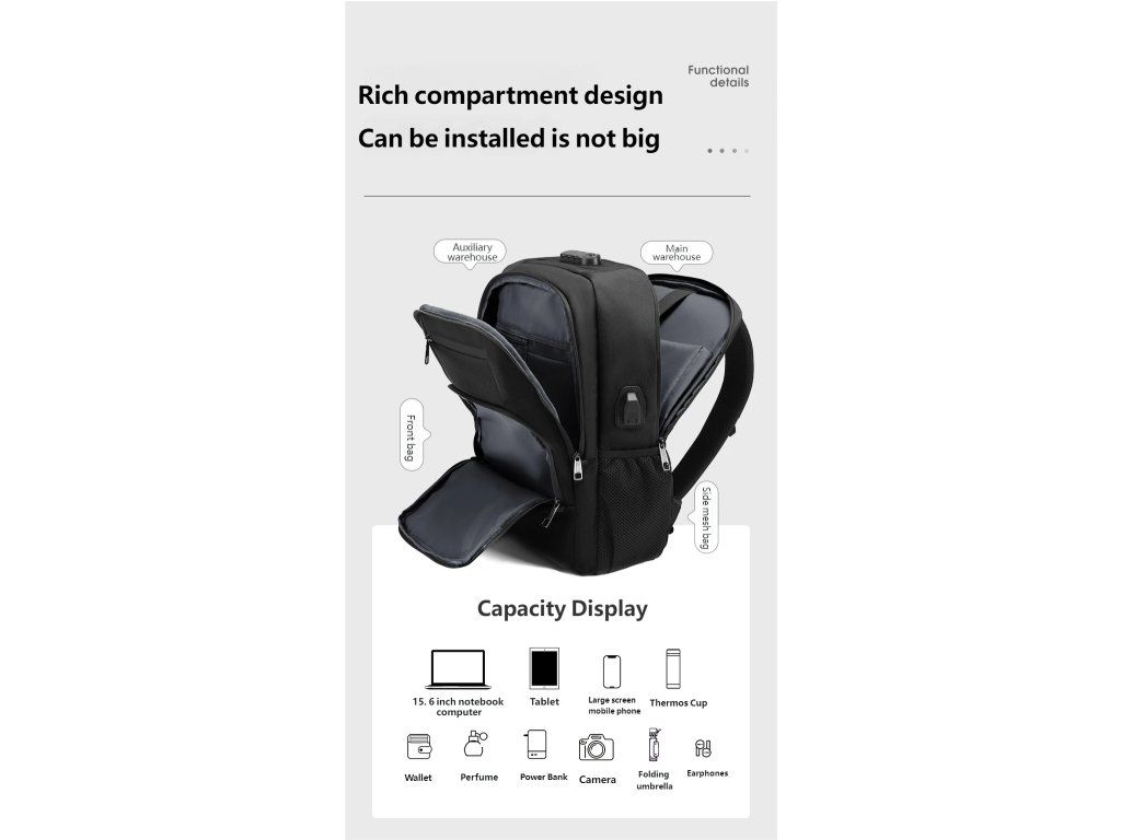 Batoh Tigernu je vynikající volbou, jak si uložit na cesty všechny své věci. Notebook je bezpečně umístěn v zadní části batohu v největší kapse. K němu můžete přihodit velká sluchátka, něco na čtení a další věci, které se vám budou na cestu hodit. Vpředu je pak menší kapsa, která má v sobě několik přihrádek a je tak vhodná pro uložení psacích potřeb, cestovních dokladů a jiných drobnějších věcí. Pod ní je ještě jedna menší, kam umístíte třeba menší tablet nebo telefon.
