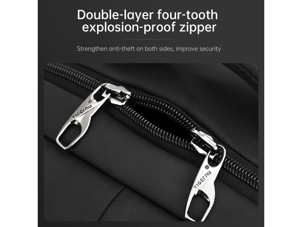 Batoh na notebook Tigernu nabídne skutečně mnoho prostoru pro všechny vaše pracovní nástroje. Zadní velká kapsa je určena pro vložení notebooku až do úhlopříčky 17 palců. Kapsa je oddělená a notebook jí tak bude mít sám pro sebe. Do kapsy před ním pak bez problémů přidáte tablet, myš, nabíječku a další doplňky. Stejně tak skýtá prostor na sešity, knihy, sluchátka a další věci. Do předních dvou kapes pak přijde příslušenství, které často používáte a potřebujete ho mít hned po ruce. Kapsy jsou šikovně schované ze strany a zabezpečené šikmými zipy.