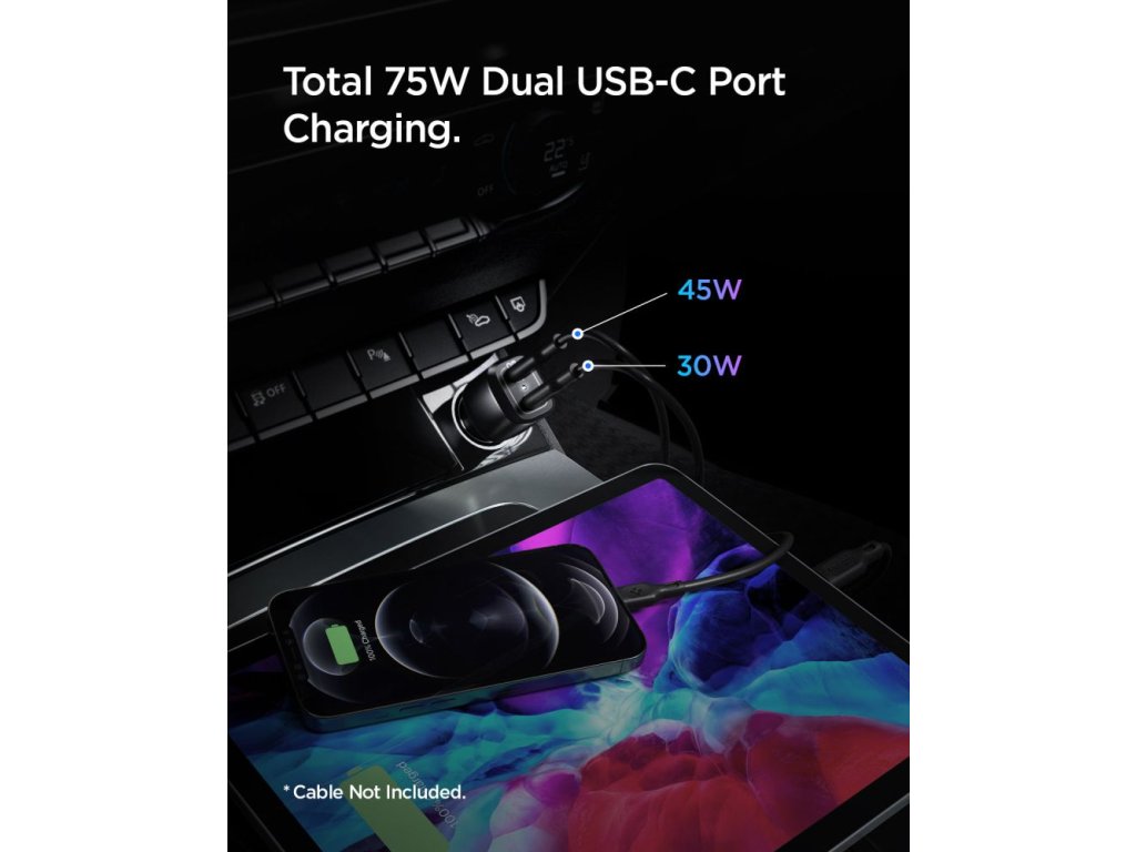 Nabíječka do auta pro telefon a počítač od Spigenu má dva USB-C porty s podporou technologie Power Delivery. Dokáže rychle nabíjet váš notebook, MacBook a další zařízení, a to až do výkonu 45 W. Hodí se tak například pro MacBook Air nebo další počítače s USB-C. Druhé USB-C pak zvládne dodávat nabíjecí výkon až 30 W, kterým dobijete rychle iPhone i iPad a menší přenosné počítače. Celkově tak lze dodávat energii dvěma zařízením o celkovém výkonu 75 W.