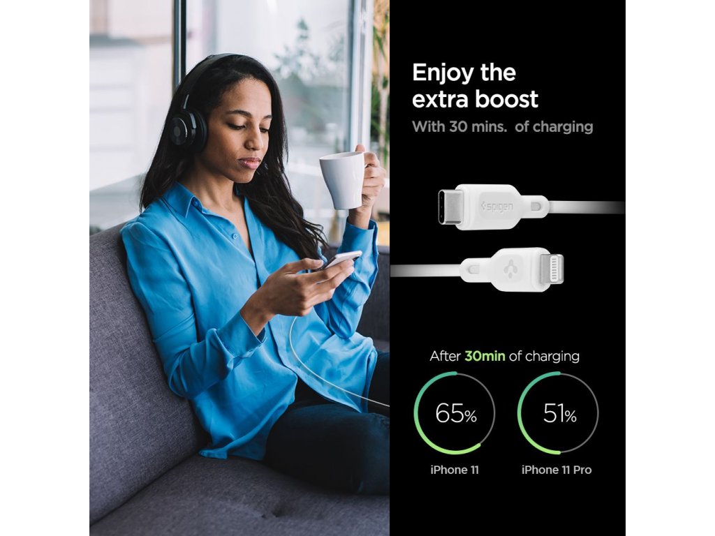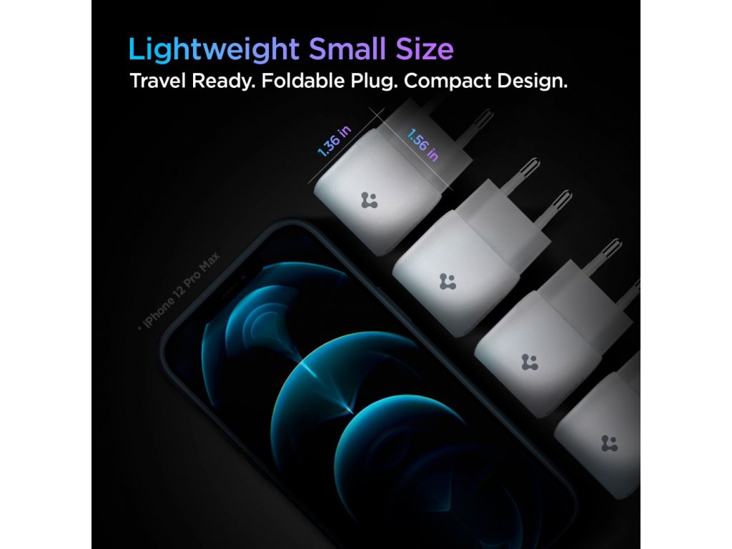 Rychlá nabíječka do sítě pro iPhone a Spigen podporuje funkci Power Delivery pro bleskurychlé dobíjení Apple produktů a součástí je také nabíjecí Lightning kabel. Adaptér je velmi malých rozměrů a GaN technologie zajistí nabíjení bez zahřívání.