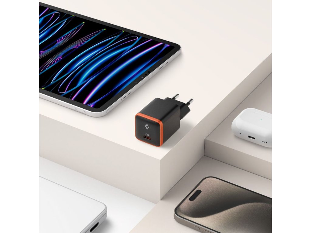 Nabíjecí AC adaptér Spigen vám pomůže při nabíjení telefonů a tabletů. Podporuje Power Delivery s nabíjecím výkonem až 30 W. Brát si ho můžete všude s sebou na cestách nebo využívat pro napájení bezdrátových nabíječek, případně MagSafe nabíječek.