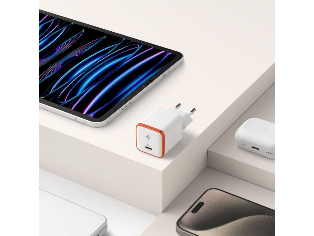 Nabíjecí AC adaptér Spigen vám pomůže při nabíjení telefonů a tabletů. Podporuje Power Delivery s nabíjecím výkonem až 30 W. Brát si ho můžete všude s sebou na cestách nebo využívat pro napájení bezdrátových nabíječek, případně MagSafe nabíječek.