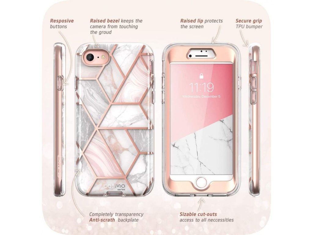 Supcase Cosmo má v zadní části velmi moderní texturu, vhodnou zejména pro ženy nebo dívky. Panel je tvořený dvojitým krytím z TPU plastu. V oblasti objektivů je přesný výřez, který ještě přesahuje kamery a brání tak v poškrábání optiky.