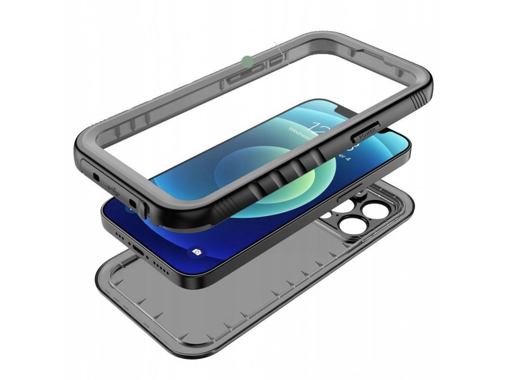 Vodotěsný kryt pro iPhone kombinuje pouzdro s ochranným sklem. Kolem jsou pogumované hrany, který absorbují případný náraz a velmi pohodlně se telefon v pouzdru drží. Je vyrobeno ze směsi měkkého termoplastu a tvrzeného polykarbonátového povlaku, který mu dodává velmi vysokou pevnost. Obě části krytu se skládají dohromady díky konstrukci Snap-On.