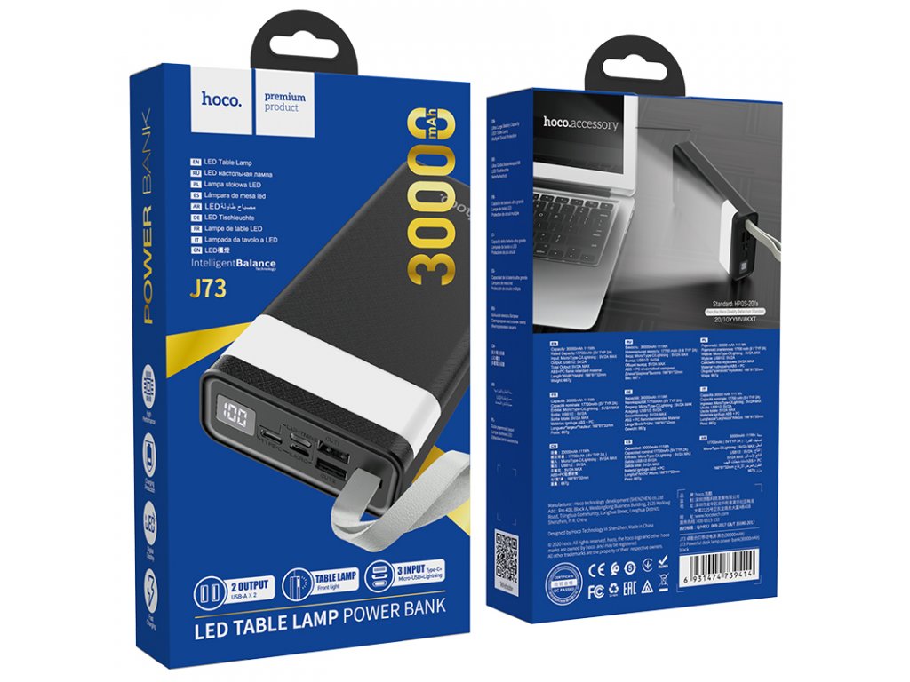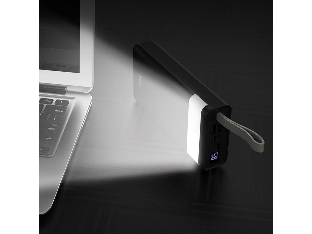 Externí baterie Hoco J73 nabízí ohromnou kapacitu 30 000 mAh a nejedná se přitom o velké příslušenství. Přehled o nabití usnadňuje LED displej. Na předním boku jsou 2 nabíjecí USB porty, které zvládnou dobíjet v jednu chvíli 2 zařízení a dobití powerbanky můžete provést až 3 různými kabely. Powerbanka poslouží také jako lampička.