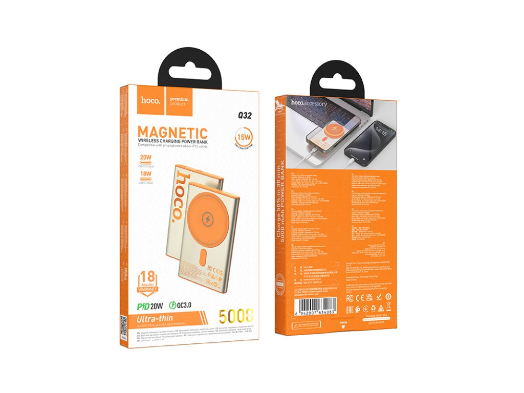 Powerbanka s MagSafe Hoco Q32 je obdařena magnety pro rychlé uchycení na záda iPhonu. Kapacita 5 000 mAh vystačí na více než jedno celé dobití telefonu. Dobije ale i drátově skrz USB-C nebo jako standardní bezdrátová nabíječka a vyniká krásným hliníkovým vzhledem.