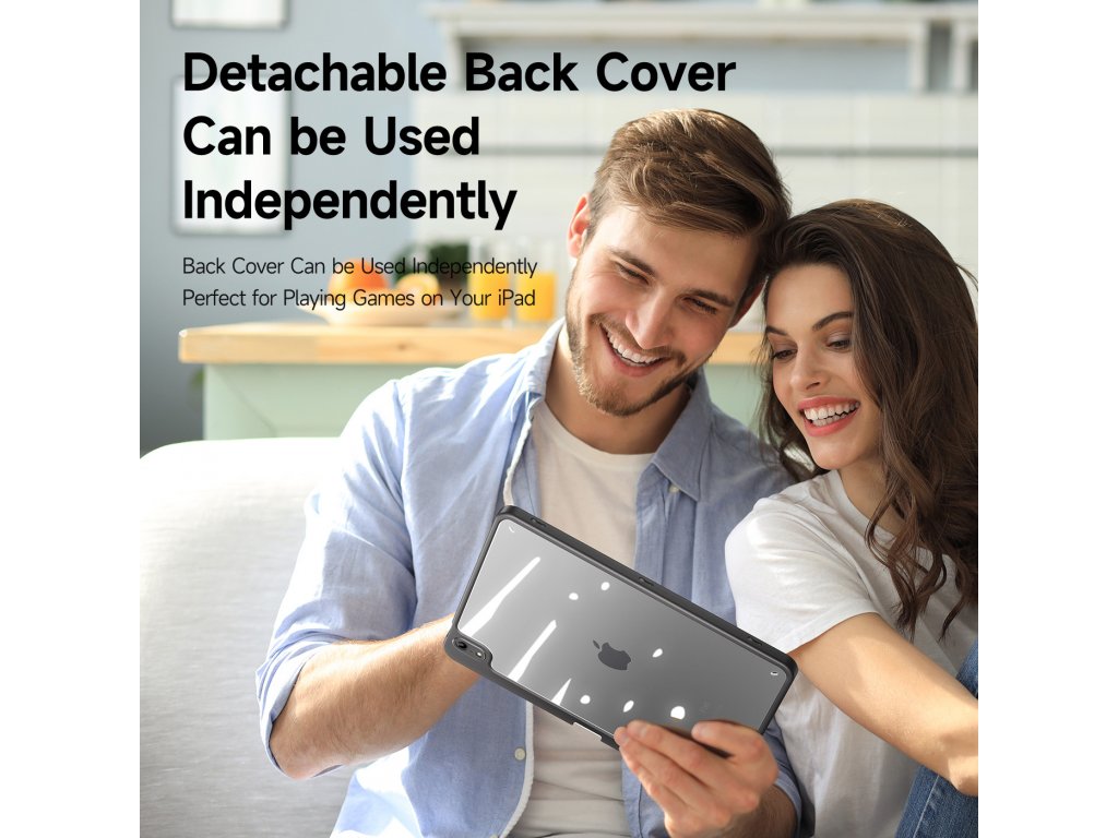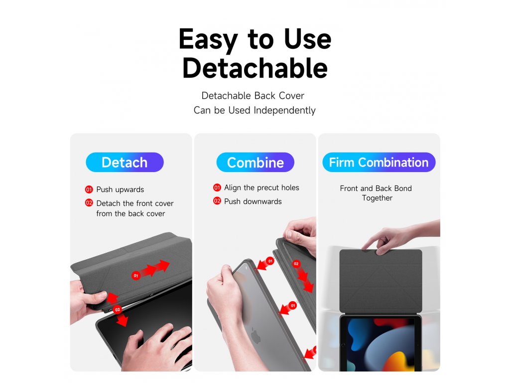 Kryt na iPad velmi rychle nasadíte a v plastovém obalu bude tablet perfektně držet. Záda jsou průhledná, takže vynikne originální design iPadu. Přední část se dá lehce skládat a při otevření se iPad automaticky rozsvítí. Zavření krytu zase displej zhasne a šetří tím energii. Navíc jde odpojit přední část a používat pouze kryt zad. Je to jen na vás.