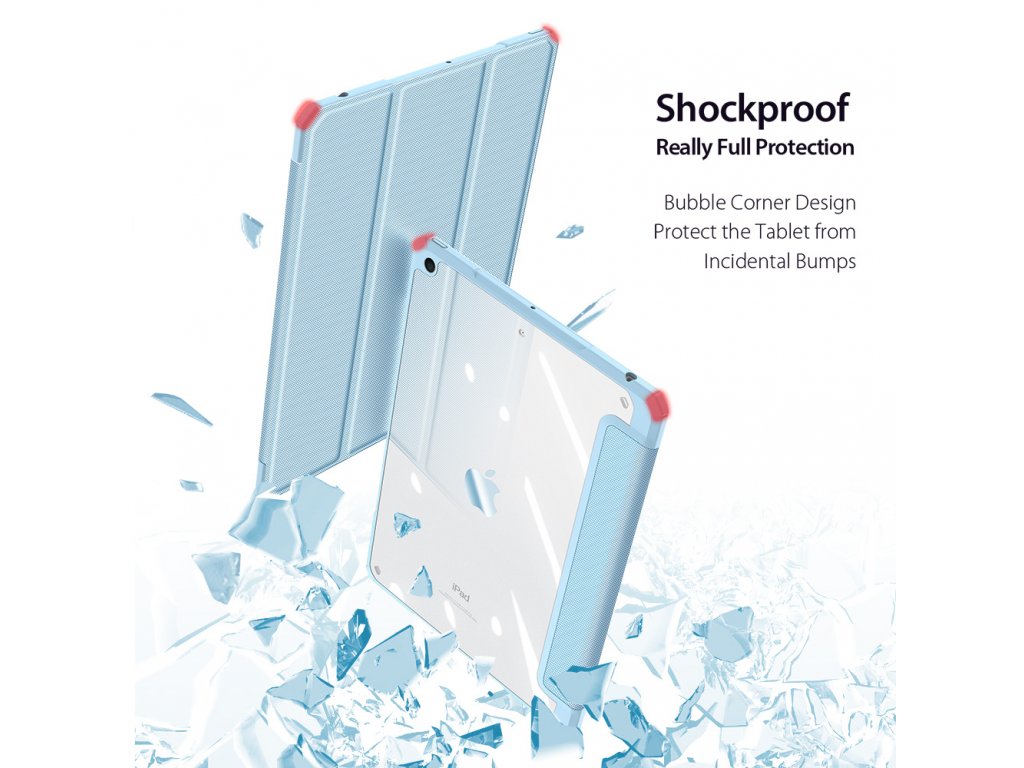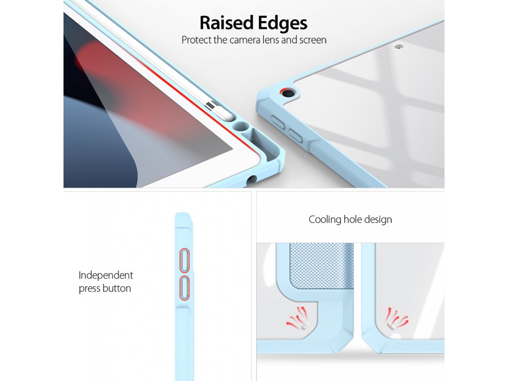Ochranný kryt na iPad je opravdu odolný. Vyztužené rohy brání rozbití při pádech. Zadní část krytu je vyrobena z odolného plastu, který je velmi flexibilní a dokáže chytře rozvádět teplo tak, aby se zařízení v obalu nepřehřívalo. V rozích jsou chytře provrtány nenápadné otvory pro ještě lepší odvod tepla. Nemusíte se ani bát, že by se v krytu poškrábal zadní fotoaparát, protože obal přečnívá nad čočku a chrání ji. Navíc díky průhledné zadní části můžete nadále dávat na odiv krásu Apple tabletu.