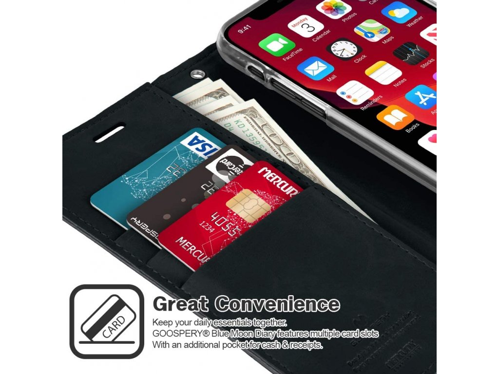 Ochranné pouzdro na iPhone Mercury Bluemoon Diary je zavírací elegantní kryt pro Apple telefony. Příjemný obal plní kromě ochranné funkce také použití jako stojánku nebo přihrádky pro uložení drobné hotovosti.