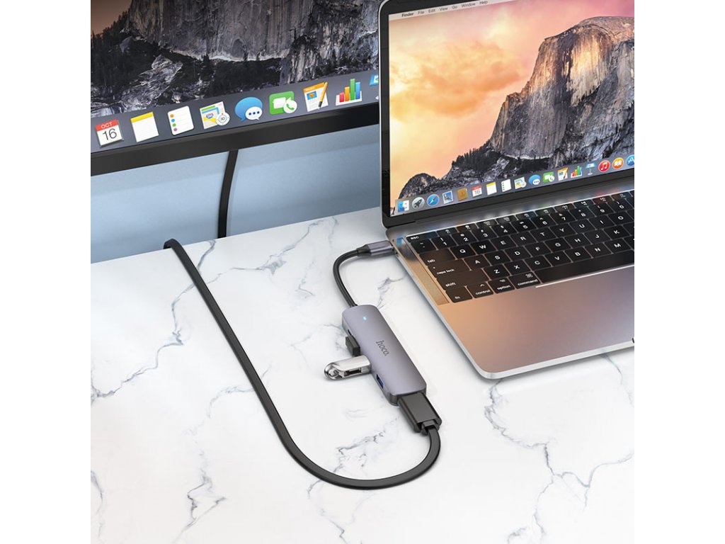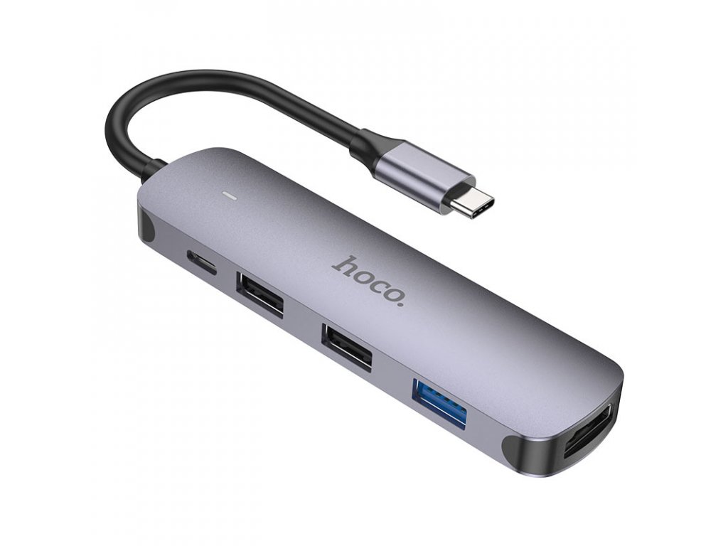Redukce USB-C Hoco HB28 je ideálním pomocníkem pro rozšíření jednoho USB-C portu na další užitečné porty. Budete mít tak navíc 2 klasické USB, HDMI a USB-C. Redukce USB-C je velmi skladným příslušenstvím, které pohodlně dáte do větší kapsy nebo cestovní brašny s počítačem. Díky flexibilnímu kabelu si adaptér pohodlně narovnáte pro zapojení do požadované polohy a také transport je tím velmi usnadněn. Adaptér funguje ihned po připojení a není nutné instalovat dodatečný software. Spolupracuje s Windows, Google Chrome OS, macOS i dalšími operačními systémy. USB-C adaptér je vyroben z hliníkové slitiny a odolného ABS plastu, dobře odvádí teplo a vydrží i hrubší zacházení. Také se výborně hodí k hliníkovým strojům, jako jsou například MacBooky. Váží pouhých 45 gramů a rozměry 109 x 28,8 x 11,6 mm jsou maximálně skladné. Kabel je dlouhý 13,5 cm, což je dostatečná délka pro zapojení do jakékoliv pozice.