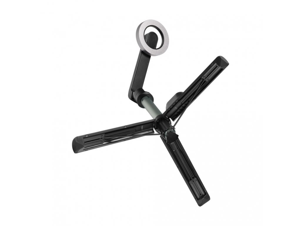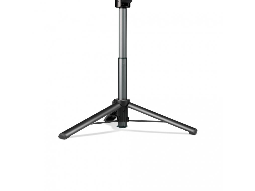 Stojánek pro iPhone je opatřen třemi nohami, které udrží stabilně selfie tyč v pozoru a s nasazeným telefonem. Nohy lze jednoduše zase složit a získat tak rukojeť pro záběry z ruky.