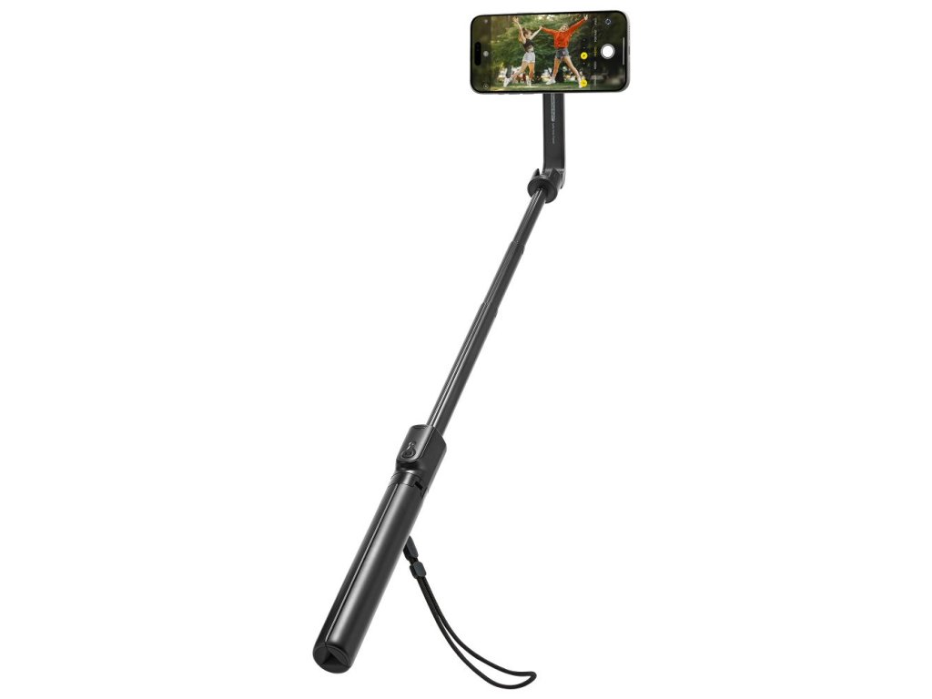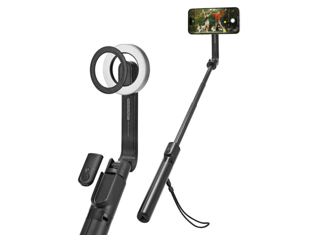 Selfie tyč pro velké telefony pojme i rozměrná zařízení. Podmínkou je, že musí mít MagSafe. To jsou tedy Apple telefony iPhone 12 a novější. Telefon v držáku lze natočit do libovolného úhlu.