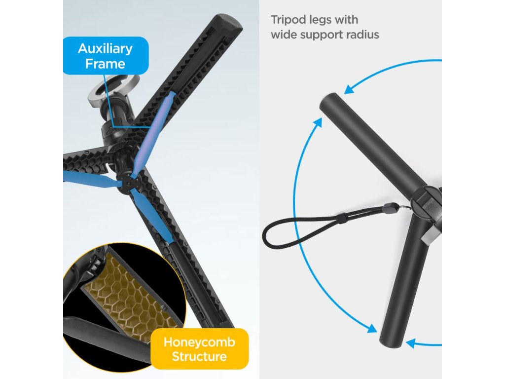 Stojánek pro iPhone je opatřen třemi nohami, které udrží stabilně selfie tyč v pozoru a s nasazeným telefonem. Nohy lze jednoduše zase složit a získat tak rukojeť pro záběry z ruky.