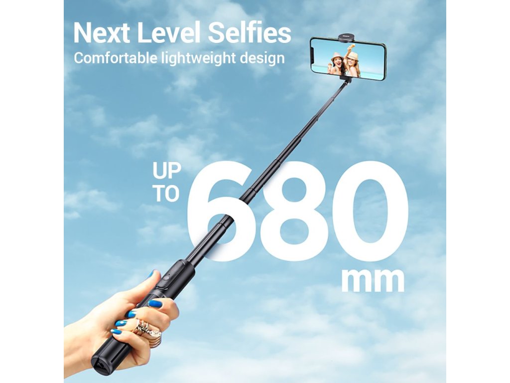 Selfie tyč pro iPhone s dálkovým ovládáním je velmi skladná, ale v rozloženém stavu její rameno vysunete až do vzdálenosti 68 cm. To je dostatečná vzdálenost na to, abyste zachytili sebe i velkou skupinku lidí. Dálková spoušť na tyči je odnímatelná a Bluetooth spojení s telefonem vydrží i na 10 metrů. Prodleva spouště činí pouhých 0,1 sekundy, takže pořídíte fotografuji v podstatě okamžitě a baterie v ovládacím tlačítku vydrží na jedno nabití kolem 10 000 fotek.