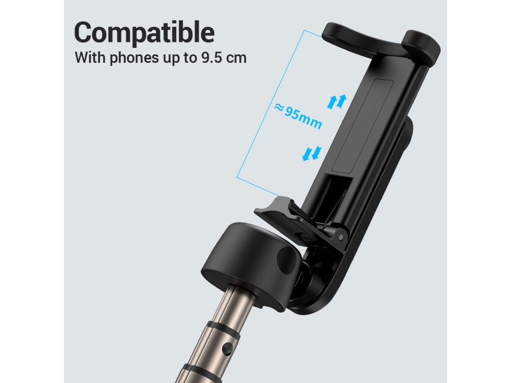 Selfie tyč pro velké telefony pojme i rozměrná zařízení se šířkou až 9,5 cm. To je dost na vložení jakéhokoliv iPhone telefonu a naprostou většinu konkurenčních chytrých telefonů. Telefon v držáku lze natočit do libovolného úhlu.